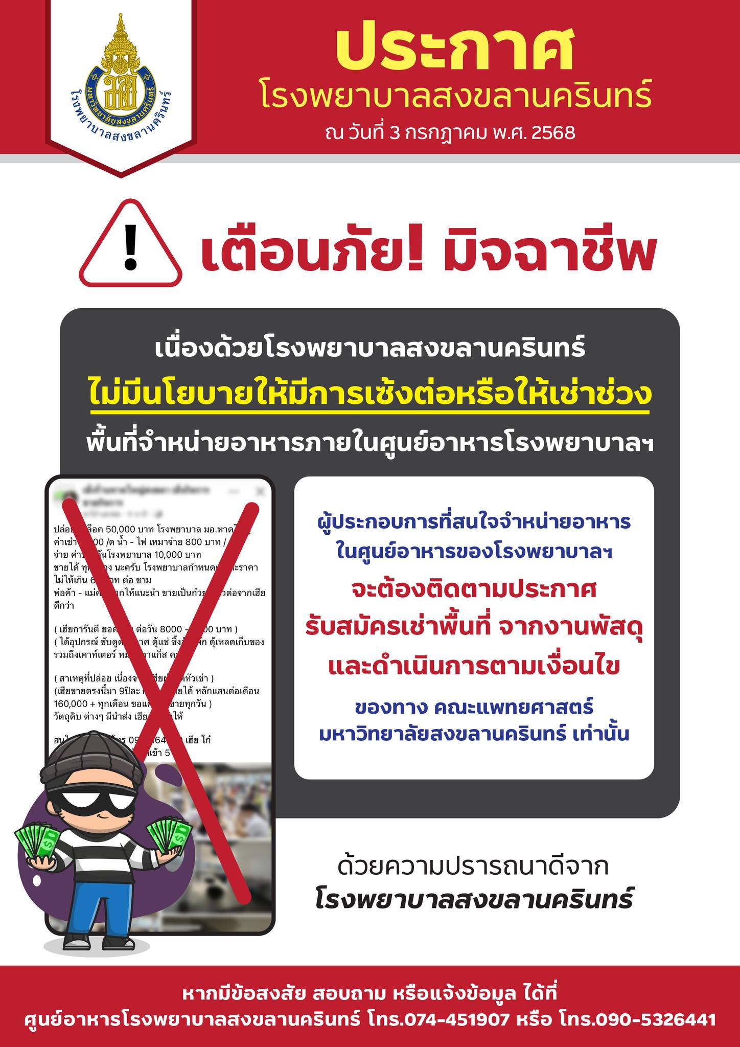 เตือนภัย! มิจฉาชีพ เนื่องด้วยโรงพยาบาลสงขลานครินทร์ ไม่มีนโยบายให้เซ้งต่อหรือให้เช่าช่วงพื้นที่จำหน่ายอาหารภายในศูนย์อาหารโรงพยาบาลฯ