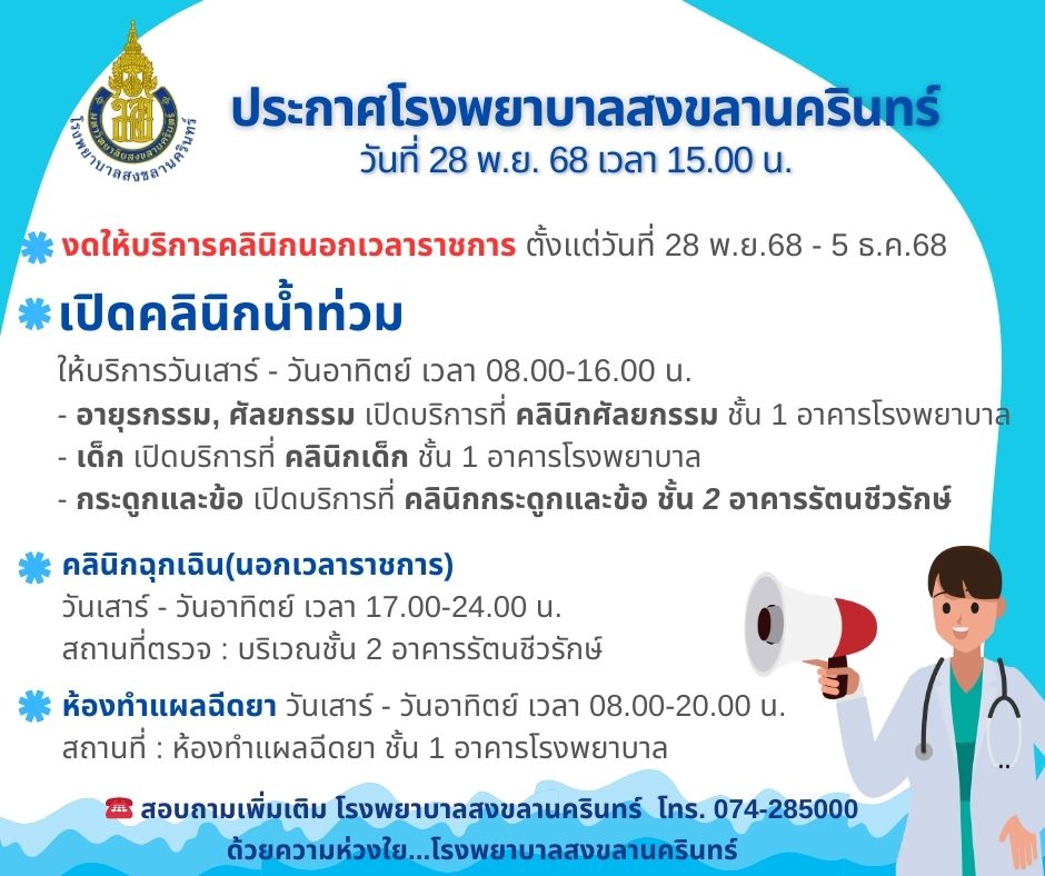 ประกาศเวลาทำการโรงพยาบาลสงขลานครินทร์ ณ วันที่ 28 พฤศจิกายน 2568