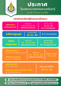 March 6, 2026 แจ้งย้ายคลินิกผู้ป่วยนอกชั่วคราว (ประกาศ ณ วันที่ 10 มีนาคม 2569) อ่านต่อ February 27, 2026 ปรับอัตราค่าบริการคลินิกนอกเวลาราชการทำแผล – ฉีดยา อ่านต่อ February 10, 2026 ประกาศงดให้บริการ วันหยุดตรุษจีน (17 ก.พ. 69) อ่านต่อ January 27, 2026 แนวทางการคัดกรองผู้ป่วยสงสัย ติดเชื้อไวรัสนิปาห์ (Nipah Virus) อ่านต่อ January 16, 2026 โรงพยาบาลสงขลานครินทร์ขอสงวนสิทธิ์ไม่ให้เข้าพบบุคลากรโดยมิได้นัดหมาย (ประกาศ ณ วันที่ 16 มกราคม 2569) อ่านต่อ October 31, 2025 แนวปฎิบัติการบันทึกภาพ/เสียง อ่านต่อ